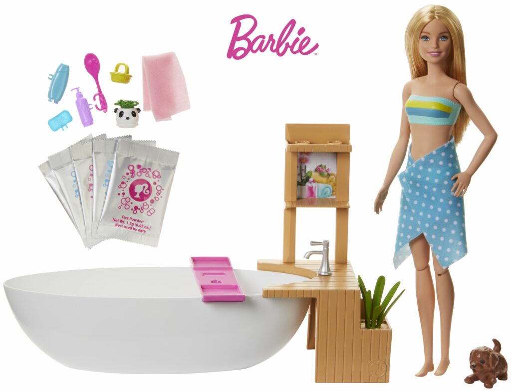 Barbija zin, lai būtu viena no labākajām, nepieciešams dot sev arī labāko aprūpi! Šis tematiskais spa rotaļu komplekts godina vienu no viņas iecienītākajiem veidiem, kā uzlādēties: burbuļojoša vanna. Tai komplektā ir Barbie® lelle, kucēns, spa vanna un aksesuāri, lai atveidotu reālu, burbuļojošu vannu. Vienkārši piepildiet vannu ar ūdeni, ielieciet tajā Barbie® lelli un pievienojiet vienu no pieciem komplektā iekļautajiem mirdzošajiem burbuļošanas iepakojumiem, lai ūdens sāktu burbuļot gluži kā īstā spa. Piemērots bērniem no 3 gadu vecuma. lelle nevar stāvēt patstāvīgi. Krāsas un aksesuāri var atšķirties.